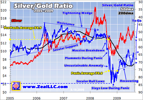 This SGR reversion’s potential silver impact is easiest to understand if we start in the normal years preceding last autumn’s crazy stock panic. This first chart compares silver with gold over the last 5 years or so. The 44 months between January 2005 and August 2008 are the control period, showing silver’s natural and normal behavior. And the 4 months between September to December 2008 encompass the panic period where the SGR anomaly erupted.