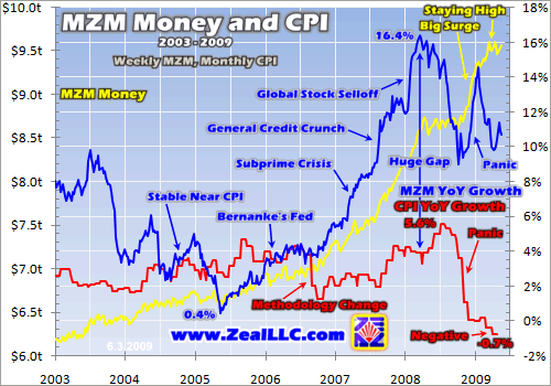 Back in the mid-2000s, MZM growth was stable near CPI growth. In 2004 and 2005, YoY MZM growth averaged 3.1% while YoY CPI growth averaged 3.0%. Also, note above that prior to mid-2006 the CPI direction generally mirrored that of MZM growth. If MZM growth rates were increasing, so were the CPI’s. And vice versa. But in 2006, a couple major events sowed the seeds for the massive MZM/CPI disconnect we are seeing today.