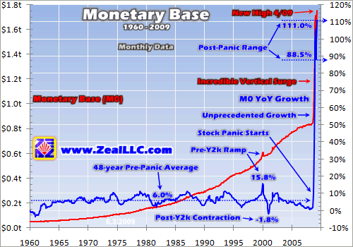 If I ended this essay here, investors would have plenty of reasons to deploy capital in investments like commodities that thrive in inflationary times. Our subscribers have already earned big gains in this sector since the panic. But amazingly, this high sustained MZM growth is minor compared to the primary inflation threat. Even though it is going to drive huge gains in my investments, this next chart really frightens me.