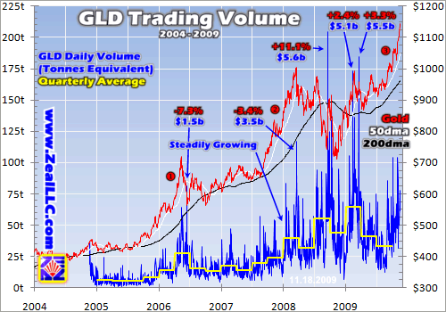 Though beyond the scope of this essay to prove on a day-to-day basis, GLD’s activity in the gold markets is increasingly impacting the gold price. And through GLD, prevailing stock-trader psychology on gold is becoming more important than ever before. Greed and fear among GLD traders is amplifying big gold up days and down days, and the larger GLD grows and the more widely it becomes held the more significant and frequent this influence and interaction will become.