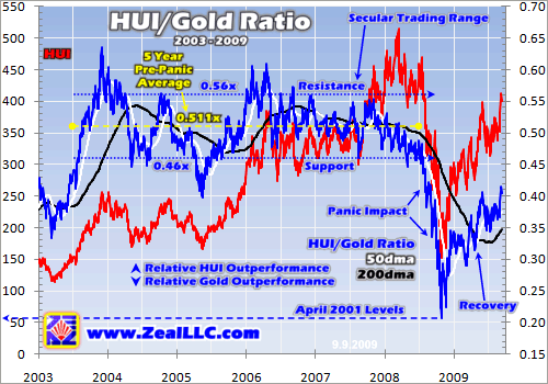 Until last year’s panics (yes there were two, a bond panic followed by a stock panic), the HUI’s relationship with gold was very well-established as the HGR reveals. For 5 years, the HGR generally traded in a tight range between 0.46x to 0.56x. In other words, the HUI usually meandered between 46% to 56% of the price of gold at any given time. And the actual 5-year pre-panic HGR average ran 0.511x.