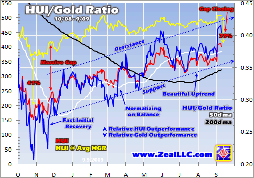 And so far, the HGR’s mean-reversion normalization trend is beautiful. This ratio has indeed been rising on balance since the panic, gradually meandering between support and resistance. Sometimes there are periods of time when the HGR consolidates, the HUI is merely pacing gold’s moves. But sooner or later buying once again floods into gold stocks which drives differential HUI surges at rates far exceeding gold’s gains. The net result is the HGR climbing inexorably back towards its pre-panic levels.