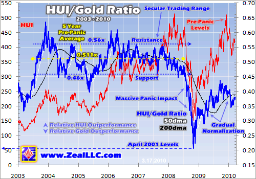 Check out the HGR in the chart above. After plummeting under 0.21x in the stock-panic abyss, this ratio steadily climbed to 0.42x by early December 2009 before this latest healthy HUI correction. This week it was sitting around 0.38x, just over halfway between its panic lows and pre-panic average. Is there any reason why this post-panic gold-stock recovery should suddenly stop now, at such low levels relative to history, after the HGR has already been recovering for over a year? Certainly not that I can discern.