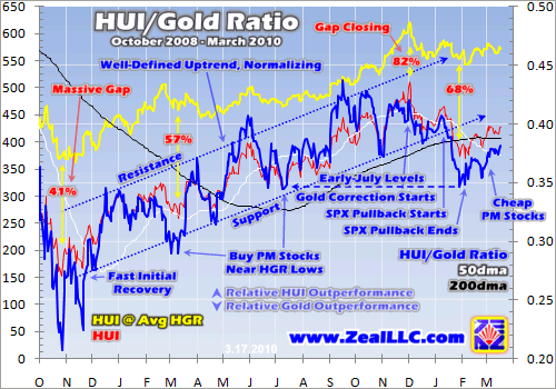 What supports such an assertion? The levels of gold stocks relative to gold before, during, and since the panic. At Zeal we were aggressively buying and recommending elite precious-metals stocks in the heart of the panic, our subscribers have already earned legendary gains in this post-panic recovery. And the very same HUI/Gold Ratio analysis that led us to buy back then continues to look very bullish today.