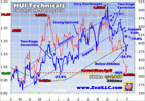 Since its latest interim high in early December, the HUI has fallen 26.7% in just under 8 weeks. As is often the case in PM stocks, this correction has been two-staged. There was an initial 17.6% leg down in early December that paralleled gold’s own. Gold has always been the PM stocks’ primary driver, traders buy PM stocks when gold is strong and sell PM stocks when gold is weak.