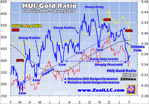 Until the second stage of today’s HUI correction, the HGR was advancing nicely over this past year. It had carved the solid support line rendered here. Each time the HGR fell to lows near this support, a sharp rally immediately followed. And all these sharp HGR rallies were driven by sharp HUI rallies. When they finally get excited, the manic-depressive PM-stock traders buy with almost as much zeal as they show in their periodic intense-selling episodes!