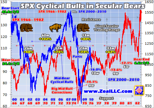 This next chart zooms out to compare our current secular bear with the previous one that ran from 1966 to 1982. While each secular bear was dominated by a seemingly-endless span of agonizing sideways grinds, the markets meandered higher for years (cyclical bulls) and lower for years (cyclical bears) within these long trading ranges. These mid-secular-bear cyclical moves always alternate between bull and bear.