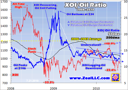 Thanks to the stock panic and its aftermath, both the XOI and XOI/Oil Ratio (XOR) have been on a wild ride over the past couple years. Driven by record oil prices in early 2008, the XOI climbed to an all-time high of 1630 in May that year. Oil averaged $125 that month, before topping itself a couple months later at an astounding $146 per barrel. But as this ratio shows, oil stocks lagged oil’s terminal ascent.