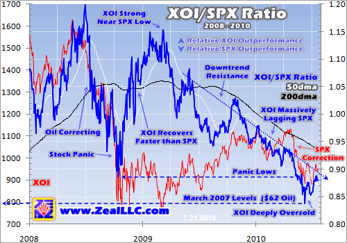 But ever since then, as the SPX cyclical bull powered higher, oil stocks have been falling farther and farther behind the general markets. The ratio downtrend has been relentless as you can see above, with the XOI massively lagging the SPX. When the SPX topped before its recent correction in late April 2010, this ratio was running 0.93x. This was not far above its panic lows of just under 0.89x. Even before the SPX corrected, oil stocks were almost as deeply out of favor as they had been in the bowels of the panic!