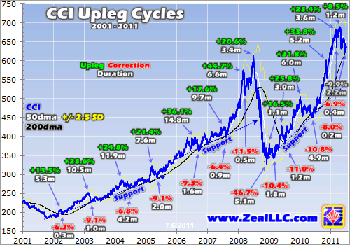 Once again the post-panic corrections averaged losses of 9.4% each over 1.7 months. This compares very closely to the pre-panic averages of 7.8% also over 1.7 months. It is very intriguing how similar corrections are today despite much faster uplegs leading into them. So when commodities as a group are correcting, once the CCI loses 8% to 9% and 6 or 7 weeks have passed the odds balloon that a new upleg is imminent.