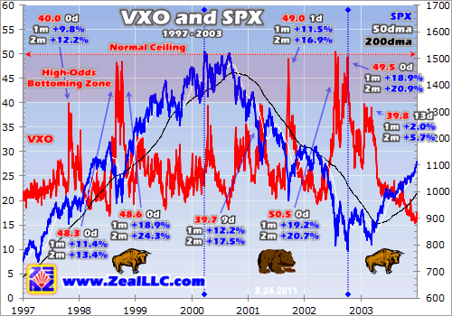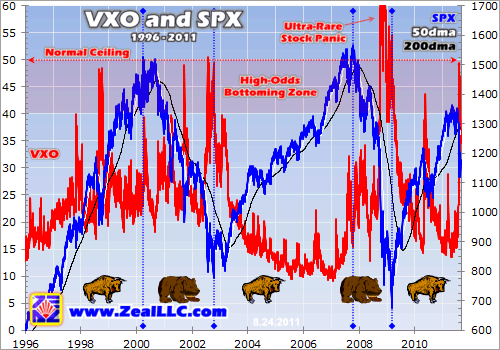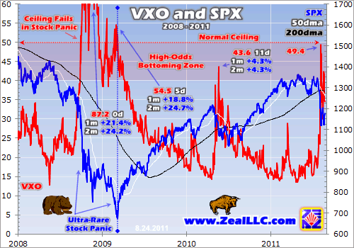 I started my own research into VXO spikes way back in the summer of 2002, and have been well aware of the VXO 50 ceiling ever since. We bought aggressively each time it was seen, and recommended our subscribers do the same. They’ve earned fortunes by steeling themselves to buy low when everyone else was scared and then later sell high when everyone else was greedy. We bought aggressively during 2008’s stock panic too, even though I hadn’t anticipated an ultra-rare VXO super-spike. Their great rarity makes them inherently unpredictable. It didn’t matter though, the subsequent gains were still enormous the following year. Excessive fear must be bought!