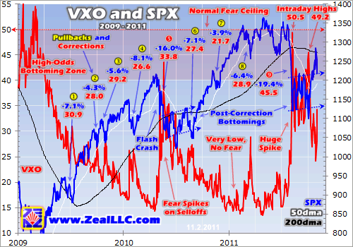 So when the stock markets have sold off and the bearish newsflow is concerning you, look to the VXO or VIX before you decide what to do. The higher the VXO, the more important it is to totally disregard the fearmongering as simply a response to weak price action. The higher the VXO, the more scary stories gain prominence as traders try to rationalize their irrational fears. But near such SPX lows are the exact wrong times to be scared. It is always foolish to sell low into a high-fear environment as measured by the VXO!