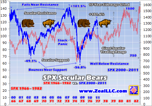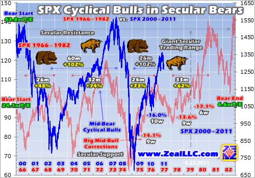All this secular-cyclical bull-bear stuff is much easier to understand once you see it visually. This first chart superimposes today’s SPX secular bear since 2000 over the last secular bear that ran from 1966 to 1982. Note that contrary to popular assumptions on bears, their secular variants don’t see prices fall straight down. Instead a secular bear is a long consolidation, a demoralizing 17-year sideways grind.