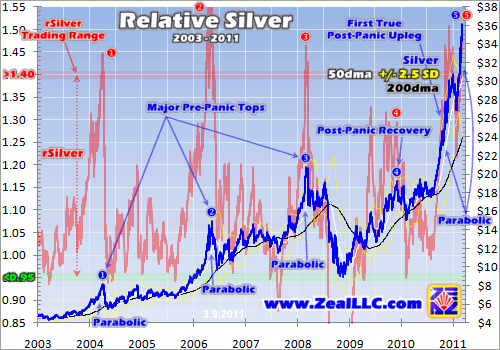 My Relativity trading system considers prices as multiples of their 200dmas. Over time, any price in a bull-market trend tends to carve a horizontal trading range relative to its 200dma. This is readily evident in silver above. If you take the blue silver price and divide it by its black 200dma line, the light red Relative Silver (rSilver) line is the result. Since 2003, silver has tended to trade between 0.95x its 200dma on the low side to 1.40x its 200dma on the high side. This relative trading range defines “too far too fast”.