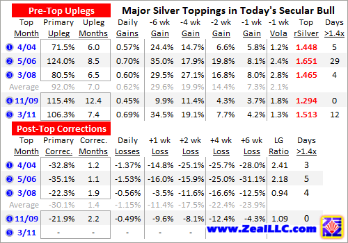 The average daily gains over the entire spans of these uplegs was 0.62%. In the final 6 weeks before these toppings, silver surged almost 30% on average. In the terminal 4 weeks, it rallied nearly 20%. In the final 2 weeks, it blasted over 14% higher. And in its final week before its upleg-ending topping, silver averaged big gains exceeding 7%. The average daily volatility ran 2.1% over this final week. Relative Silver peaked above 1.40x, and exceeded this danger zone for a varying number of days.