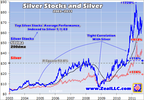 Even though the starting points are the same, naturally silver and this makeshift index are quick to diverge as their daily gains/losses differ. And as one would expect, with the exception of the anomalous 2008 panic silver stocks take the high road to reward investors for taking the risk. In this example if an investor bought the metal and the index in the beginning of 2003 and held on to current, he’d have seen gains of 913% and 1728% respectively to the highs earlier this year (if I had chosen a different start date, the gains and visuals would obviously be different).
