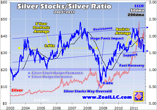 With the panic such a rare anomaly, it’s prudent to consider the SSSR in a state of normalcy prior to this historic event. And in the 5 years preceding the panic the SSSR averaged 1.64x, fluctuating between about 1.30x on the low side and 2.00x on the high side. Another way to look at this ratio is the silver-stock index closed each day about 64% higher than silver’s prevailing price.