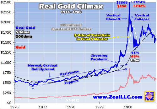 Once gold started shooting parabolic, it never really looked back. Speculators flooded into this soaring metal, including legions of ordinary American folks who had never before owned an ounce of gold. This popular mania resulted in gold prices exploding vertically in late 1979. In real 2012-dollar terms, they literally doubled in less than 2 months leading into their amazing January 1980 secular-bull climax.