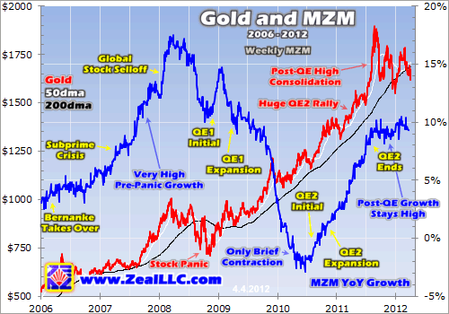 If gold hasn’t fallen without more quantitative easing, if it has been able to consolidate near all-time record highs without giving back much at all, then why does QE3 matter? With MZM growth approaching 10% annually for the better part of a year now, Bernanke and his merry band of inflationists are happily providing torrents of new fiat dollars without QE. Why are traders so myopically fixated on QE3?