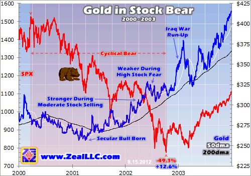 Zooming in to the individual cyclical stock bears, you can definitely see periods of time where excessive stock fear weighed on gold. This first chart looks at the first cyclical bear of the past decade’s secular stock bear, which ran from March 2000 to October 2002. Though the SPX was cut in half, a devastating loss for buy-and-hold investors, gold climbed by an eighth even though its secular bull had barely begun.