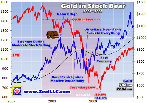 This principle of gold generally rallying but sometimes succumbing to stock fear continued in this secular bear’s second cyclical bear. Once again this ran from October 2007 to March 2009, ultimately climaxing in a once-in-a-lifetime stock panic. But nevertheless, gold still did incredibly well through the greatest fear superstorm any investor alive today will ever see. Gold thrives even during the nastiest stock bears.