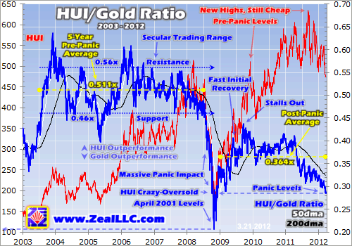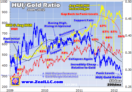 Prior to spring 2011, the HGR was indeed regaining ground relative to gold. After a fast initial recovery that made fortunes for brave contrarians like us willing to buy during and after the panic when everyone else was terrified, the HGR continued trending higher. Its rising uptrend is rendered above. At a couple HUI major interim highs in this timeframe, the actual HUI peaked at 81% to 82% of where it would have hypothetically been trading at the pre-panic average HGR of 0.511x.