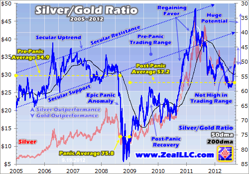 Prior to that epic panic anomaly, the SGR averaged 54.9. In other words, it took 54.9 ounces of silver to equal the value of a single ounce of gold. But like any secular relationship, the Silver/Gold Ratio exhibited a trading range that is shaded in blue above. It ran from 60 ounces of silver per ounce of gold on the low side to 45 on the high side. The latter was seen whenever silver regained favor among traders.