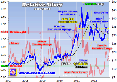 Since silver is far more volatile than gold, the rSilver trading range is naturally wider. Silver is oversold when it falls under 0.95x its 200dma, and overbought when it exceeds 1.40x. After a massive upleg far more extreme than gold’s that topped in the spring of 2011, silver has been consolidating around $34 ever since. This has given traders nearly two years to get comfortable with today’s price levels as the new normal.