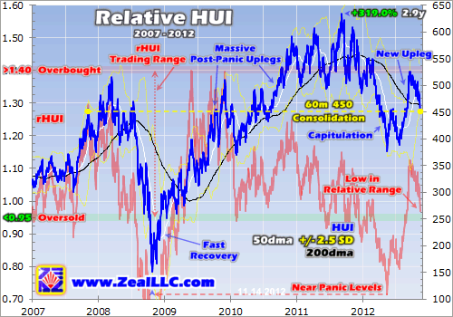 Examine this chart and look what happened after other times the HUI traded near 0.95x. Most of the time major advances soon followed. When PM stocks are oversold and fear reigns, the great majority of the near-term sellers have been squeezed out. So buyers picking up the cheap stocks regain the balance of power and the capital inflows soon drive rallies. The rHUI is positioned perfectly today for another one.