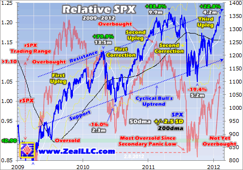 This next chart compares the SPX’s current cyclical bull that was born out of the secondary stock-panic lows in March 2009 with a key technical indicator, the Relative SPX. Based on my simple, powerful, and very profitable Relativity trading system, the rSPX restates the S&P 500 as a multiple of its own 200dma. These multiples are perfectly comparable in percentage terms over time and tend to form nice horizontal trading ranges.
