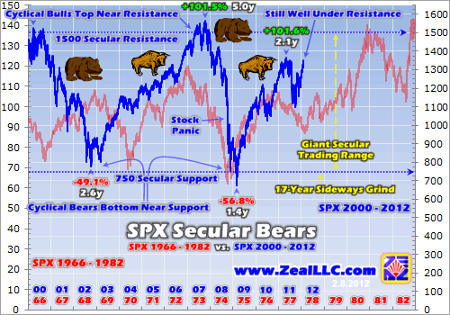 Secular stock bears are gigantic 17-year sideways grinds driven by Long Valuation Waves. In this chart the SPX’s current secular bear since 2000 is superimposed over the last secular bear straddling the 1970s. Within these giant secular trading ranges, an endless series of shorter cyclical bears and cyclical bulls alternate. Investors and speculators who understand these can earn fortunes in secular bears!