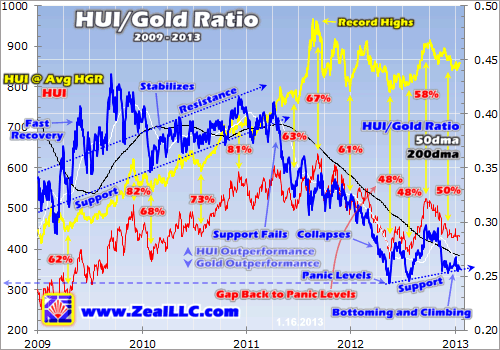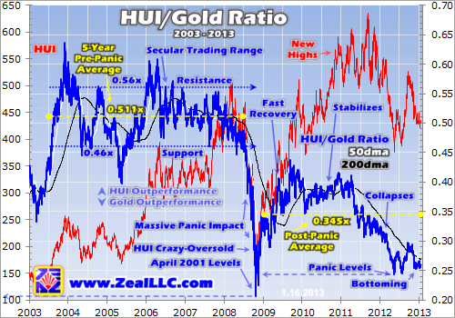 So even as gold weathered heavy fund selling in recent months triggered by fiscal-cliff tax-hike fears, the beaten-down HUI largely held its own. Gold stocks have certainly been weak, but nowhere near as weak as they could have been in light of the relentless gold selling. A new cadre of contrarian investors has been establishing positions in gold stocks with their recent panic-like prices, buying low and holding.