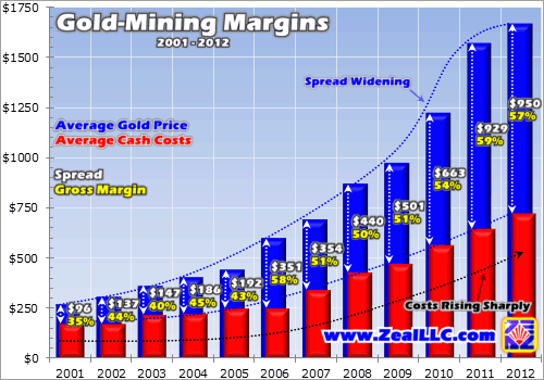 In 2006 cash costs saw an anomalous year of stability. But in 2007 they fell back into trend with a sharp ascent higher. In fact, over the last six years gold miners’ cash operating costs have risen by an annual average of 19%. 2012’s average cash cost of $719 is a crazy 184% higher than 2006. Put into a different light, 2012’s cash costs are over $100 higher than 2006’s gold price. And they’re a staggering four-fold what they were at the beginning of the bull.