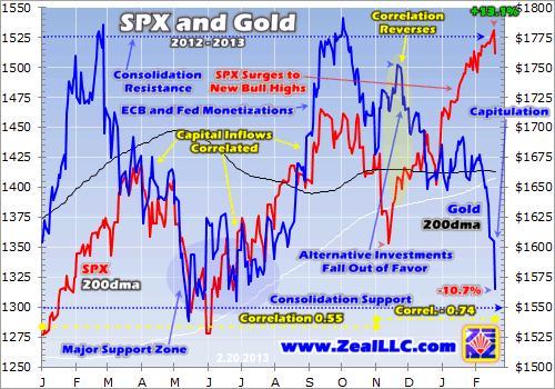 This week’s capitulation was the end result of a multi-month decay process that began with alternative investments falling out of favor in November. Remember that gold and the SPX had a 0.55 positive correlation between January and October 2012. From November to this week, that reversed totally to a much stronger 0.74 negative correlation! The levitating stock markets’ melt-up rally really weighed on gold sentiment.
