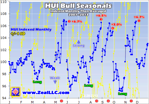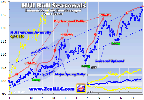 Since stock prices behave very differently in secular bulls and secular bears, I limit my seasonality studies to the secular-bull years. For gold stocks they run between 2001 and 2013, a period within which the HUI skyrocketed an astounding 1664% higher at best! A dozen years offers plenty of data to average, smoothing outsized up and down years. Throughout this long span, gold stocks’ spring rally is very clear.