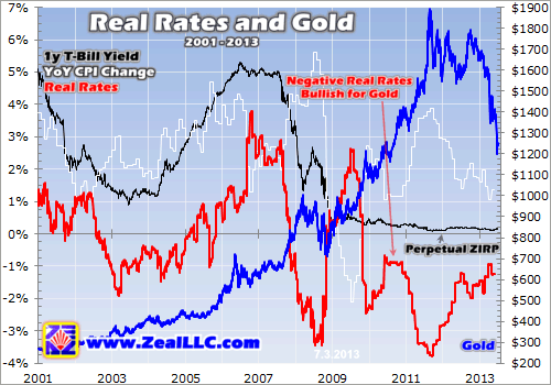 I wrote my first real rates and gold essay back in July 2001 when the metal traded at $270. I pointed out how bullish negative real rates were for gold, a hugely ridiculed contrarian position back then. My latest essay on this thread was published last November. So if you want to dig deeper, read that. But for today, just take my word for it after over a decade of study that negative real interest rates are very bullish for gold.