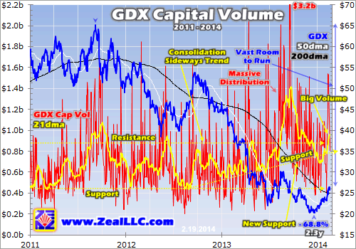 One of the many problems plaguing this past year’s Fed-driven general-stock-market levitation was the low-volume buying that drove it. Low volume shows low conviction, traders begrudgingly buying shares in moderation since they doubt a rally’s durability. Low-volume rallies are often more the result of a lack of sellers than any meaningful buying. Thankfully this certainly isn’t the case for gold stocks in 2014.