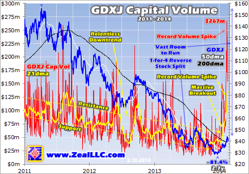 But when gold stocks started rallying as 2014 dawned, investors and speculators quickly started to grow interested in the abandoned juniors again. The GDXJ capital-volume 21dma soon started surging in a massive way, shattering its multi-year downtrend. And volume kept on rising, with this 21dma metric blasting to $136m this week. There was also a record trading day with $267m of raw GDXJ capital volume!