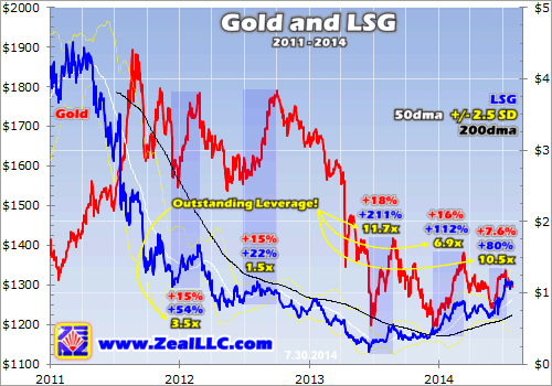 LSG was certainly due for a bounce in early 2012 following the carnage the previous few quarters. And indeed it responded nicely to gold’s first upleg. LSG was able to put together a 54% gain to gold’s 15%, solid positive leverage of 3.5x. But when the metal started falling, it quickly followed suit.