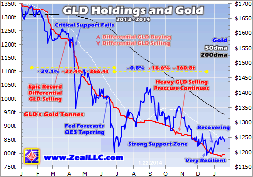 Thus heavy differential selling of GLD shares leads to heavy liquidations of GLD’s gold bullion. That flood of marginal new gold supply hitting the global markets last year was what fundamentally drove gold’s plunge. This next chart looks at the gold price superimposed on GLD’s physical bullion holdings. Once again despite GLD-selling headwinds persisting, gold showed remarkable resilience in 2013’s second half.