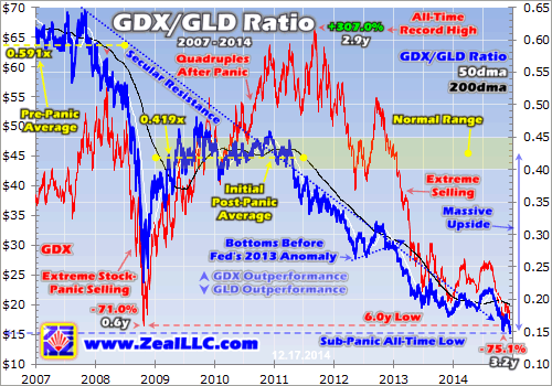 And their upside potential is truly epic. Once again, this week the GGR slumped to an all-time low of 0.149x. In the initial two-and-a-half years after the stock panic, this gold-stock valuation metric averaged a far-higher 0.419x. Merely to return to those normal-year levels, GDX (and the HUI) would have to nearly triple with a massive 182% gain! Can you imagine any other stock-market sector with such potential in 2015?
