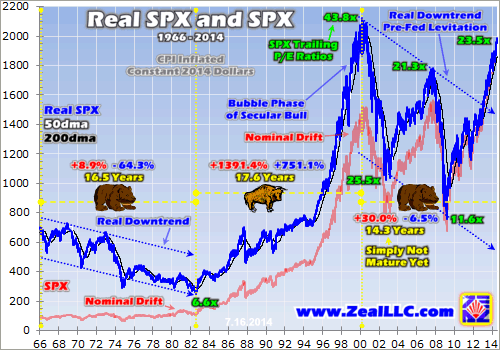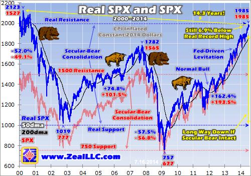 In fact, as of its latest nominal record close of 1985 just a couple weeks ago, the SPX was still 6.9% below that March 2000 record high. The implications of that fact are incredible. In the 14.3 years since the peak of the last secular stock bull, US stock prices have still not recovered! As this chart reveals in stark terms, all the US stock markets have done since early 2000 is grind sideways at best. This is ominous.