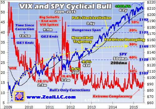 Without QE and ZIRP, the stock markets are long overdue for a serious reckoning. They are extremely overextended and hyper-complacent, which this next chart reveals. This means once stock traders start to realize the remarkable Fed tailwinds of recent years are abating, the selling pressure is likely to be fierce. That realization will mount in intensity as we get closer to the Fed’s first rate hike in a whopping 9 years.
