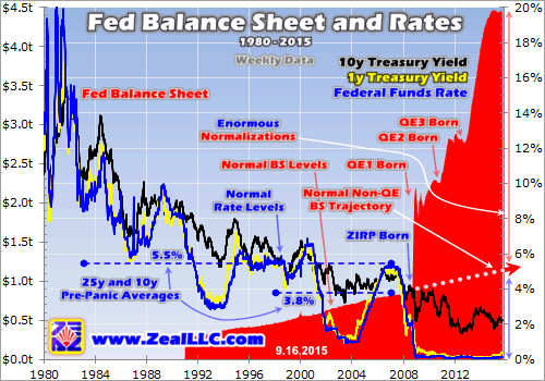 If the Fed hadn’t panicked and implemented QE in response to that stock panic after ZIRP burned all its conventional monetary-policy ammunition, a normal growth trajectory would have taken the Fed’s balance sheet up near $1.2t today. Yet thanks to QE it’s a staggering $4.4t! So the Fed somehow has to sell, or more likely roll off, $3.2t in bonds before we will know how this extreme monetary experiment turned out.