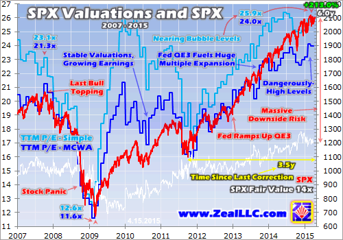 But since early 2013, valuations have shot straight up pacing the stock markets. The Fed’s QE3 debt monetization and associated jawboning ignited a huge artificial stock-market rally that wasn’t supported by underlying corporate earnings. It was pure multiple expansion, P/E ratios inflating because stock prices were rising far faster than profits. This sharp increase in valuations only moderated a bit last year.