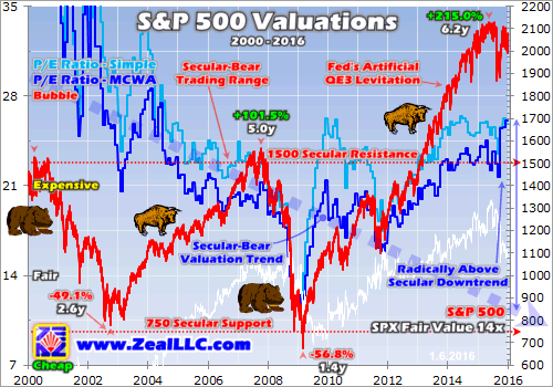 The white line above shows where the S&P 500 would be trading at historical fair value of 14x earnings. And as of the final trading day of 2015, that number was down at a shocking 1096. With the SPX exiting last year at 2044, the stock markets would have to fall 46% merely to hit fair-value price levels based on current corporate earnings! That’s right in line with typical mid-secular-bear cyclical bears that cut stocks in half.