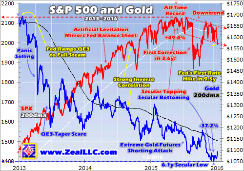 This forced GLD’s managers to spew vast amounts of gold bullion into the markets, collapsing the gold price in the first half of 2013. This extreme event caused by the Fed seducing everyone into stocks just wrecked gold-market psychology. And with stock markets continuing to levitate since, gold’s traditional role as an essential portfolio diversifier that moves counter to stock markets was forgotten by nearly all.