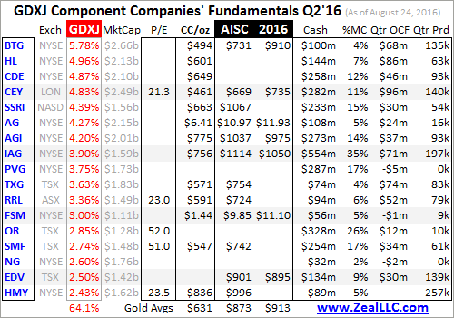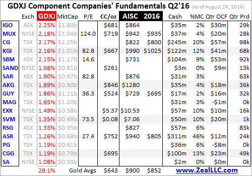 GDXJ’s component list remains very similar to that seen 3 months ago when I was analyzing this ETF’s top components’ Q1’16 results. Most of the same companies are still included, although their relative rankings have naturally shifted with their market capitalizations. The elite juniors enjoying the biggest market-cap increases, and hence stock-price gains, have seen the largest weighting increases in GDXJ.
