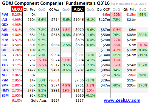 That’s followed by each company’s Q3’16 gold production, in pure-gold terms whenever available. But some GDXJ components lump in silver as gold-equivalent ounces so the gold can’t be broken out. The quarter-on-quarter change in production, the absolute percentage difference between Q2’16 and Q3’16, is shown. QoQ changes are also included for all the rest of the data in these tables, illuminating trends.