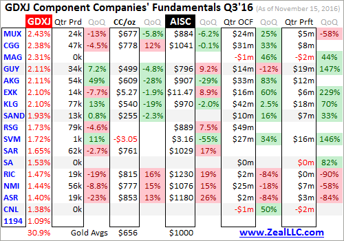 These 34 largest GDXJ components collectively accounted for a commanding 91.9% of this ETF’s total weighting. Unfortunately not all of these companies reported Q3 results. GDXJ includes gold stocks trading in Australia and Hong Kong, where financial reporting is only required in half-year increments. So those companies skip Q1s and Q3s, although they do often provide production updates which are helpful.